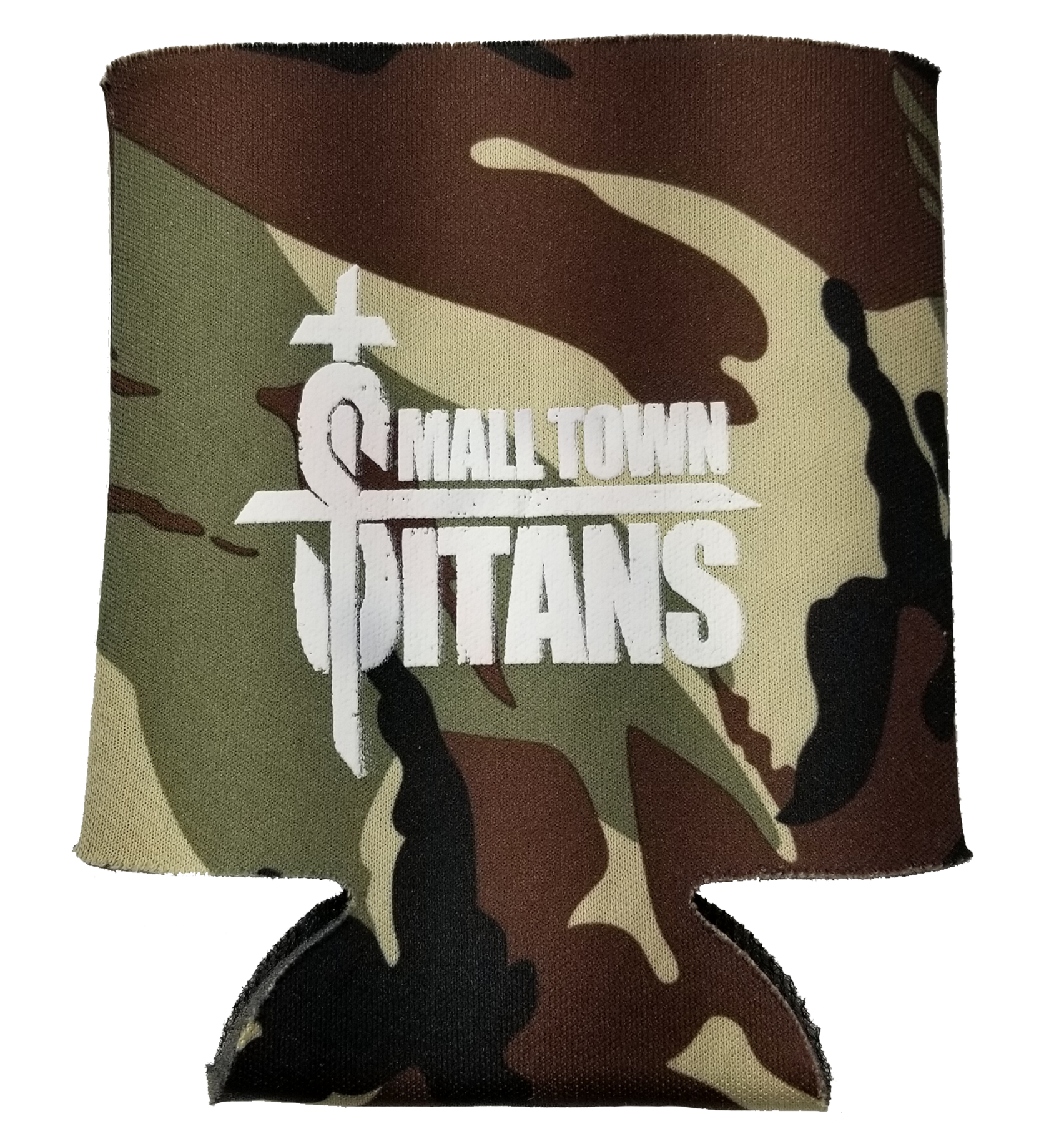 A camouflage koozie with 'SMALL TOWN TITANS' text and a cross logo on the front.